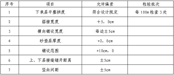 6、鋪設的土工膜及上下中、粗砂底面高程誤差、縱橫向坡度平整度滿足設計要求。施工質量要求應滿足下表: